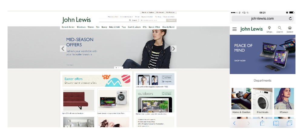 You can see in this example that for the mobile site, John Lewis have streamlined the navigation, used images that are optimised to a mobile screen and understood the main actions that users want to carry out, and ensured that they are within easy reach on the page.